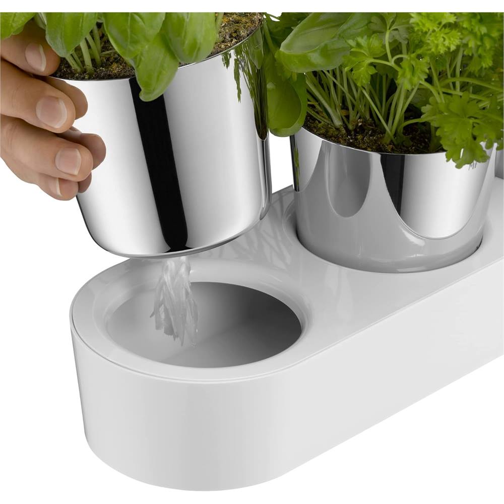 3x Pflanztopf, 1x Wassertank mit abnehmbarem Deckel (36x 12,5x 12,5 cm, Topf-Ø 10,8 cm), 3x Glasserdocht, Kräuter werden nicht mitgeliefert - Artikelnummer: 0641306040 Material: Cromargan Edelstahl Rostfrei 18/10, Kunststoff, Glasfaserdocht - die Edelstahltöpfe sind spülmaschinengeeignet. Für den Wassertank wird Handwäsche empfohlen Das Bewässerungssystem des Kräutergarten für die Küche hilft bei der richtigen Dosierung. Über den Glasfaserdocht holen sich die Küchenkräuter soviel Flüssigkeit wie sie brauchen Den Glasfaserdocht durch die Öffnung der Kräutertöpfe so einfädeln, dass etwa die Hälfte davon im Topf liegt. Pflanze mit Wurzelballen direkt in den Kräutertopf setzen und Erde leicht festdrücken Bei durchschnittlicher Raumtemperatur reicht der Wasservorrat im Tank für mehrere Tage. So bleiben die Kräuter (Basilikum, Petersilie, Schnittlauch oder Minze) wochenlang frisch