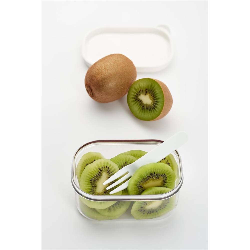Eine Gabel ist enthalten, damit Kinder das Obst sicher und einfach essen können. Die Obstkiste ist unzerstörbar und kann nach Gebrauch einfach in die Spülmaschine gestellt werden (ohne den Deckel).