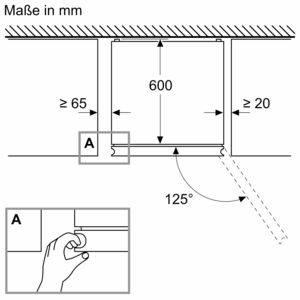 Technischer Plan einer Einbauöffnung mit Maßangaben in mm. Detailansicht „A“ zeigt Hand, die Platte einsetzt. Öffnungswinkel 125°.